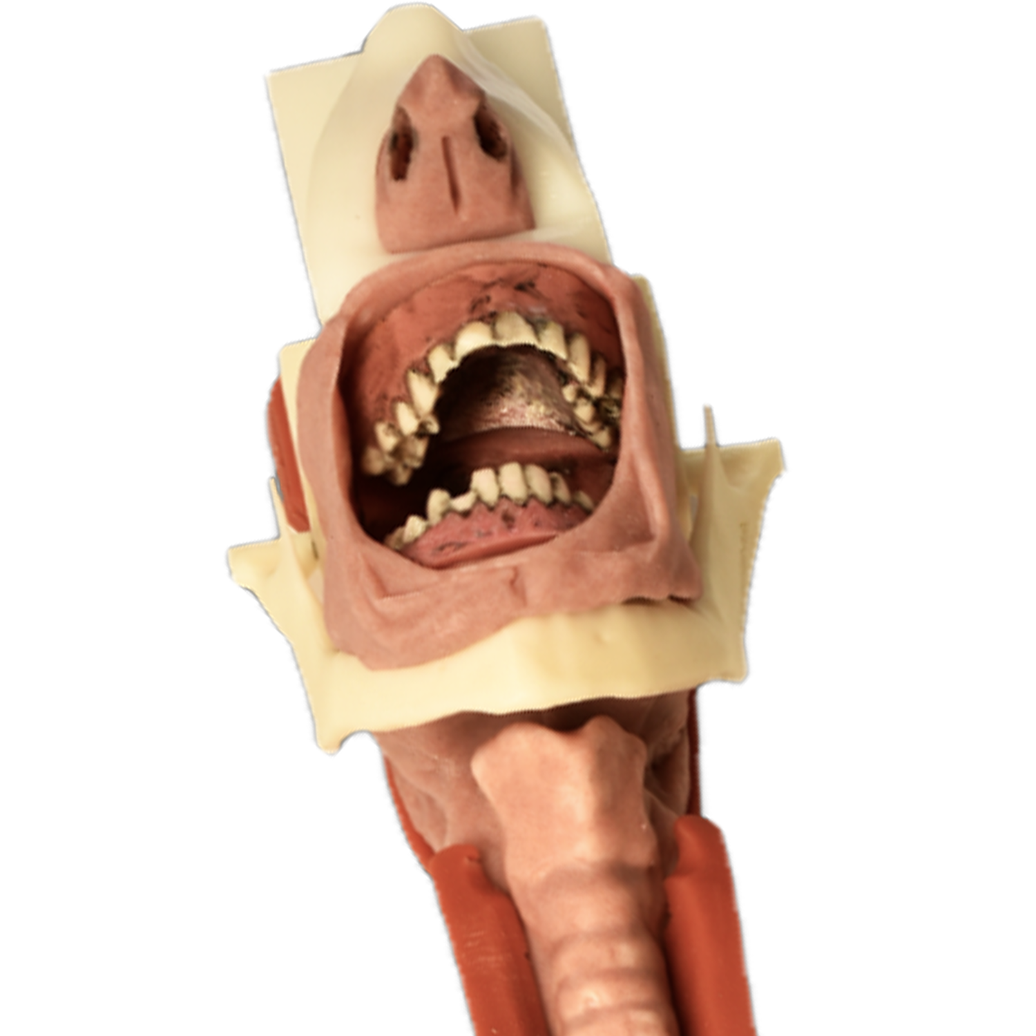 The face is easily removable for access to or replacement of, the jaw and airway. The front skull holds the airway assembly and jaw in a “muzzle” fixture system.