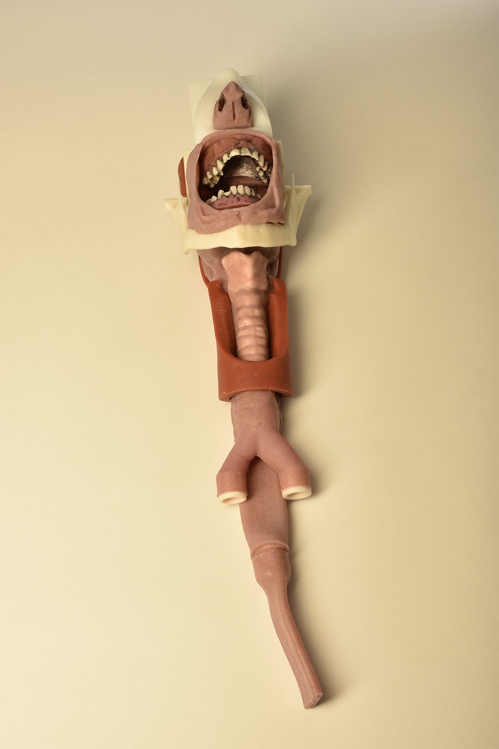 The face is easily removable for access to or replacement of, the jaw and airway. The front skull holds the airway assembly and jaw in a “muzzle” fixture system.